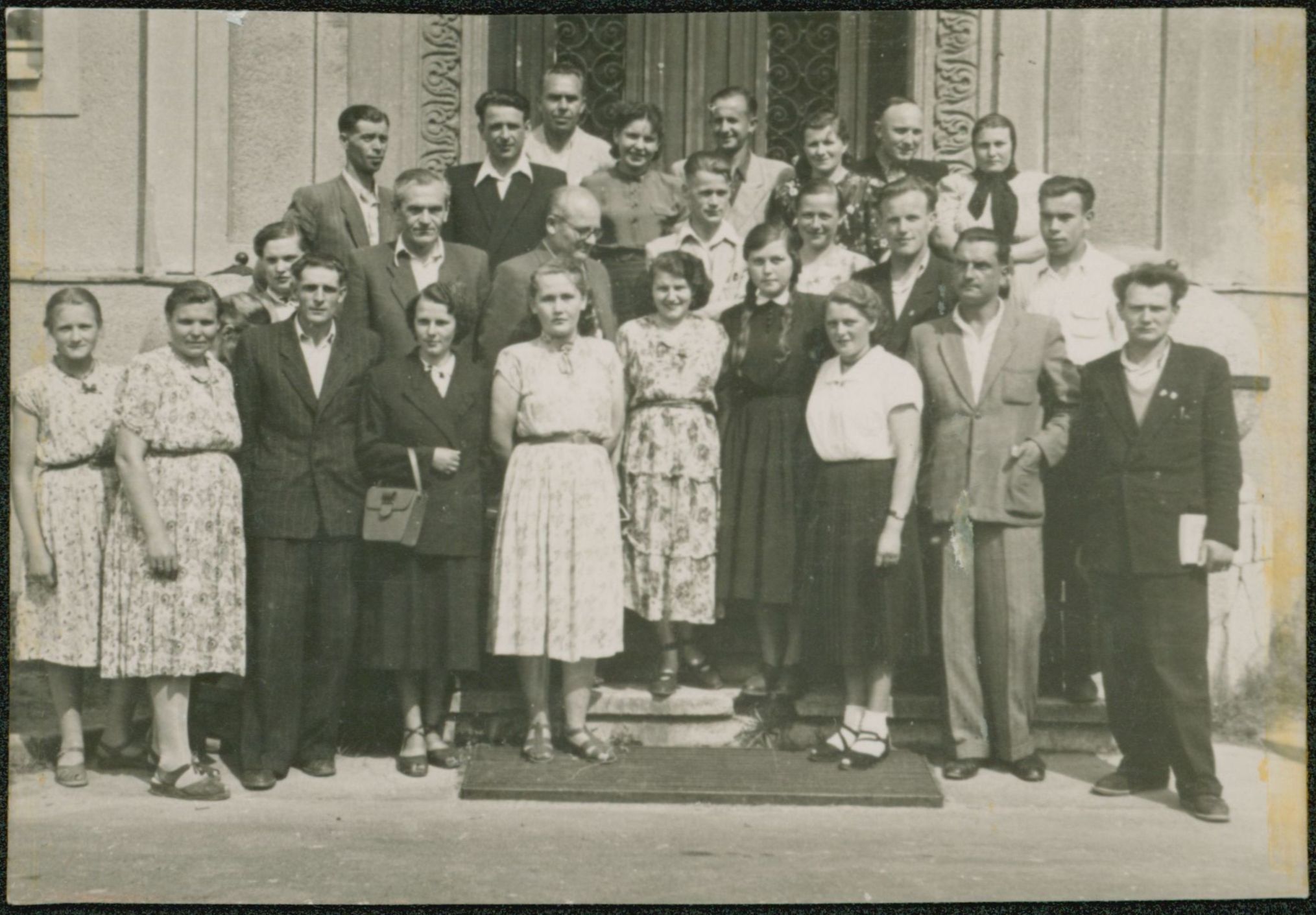 W tej budynku mieści się siedziba Urzędu Miasta i Urzędu Gminy ; na środku fotografii (w jasnej marynarce) - Wacław Gołowicz dyrektor biblioteki publicznej (1950-1979) ; fotografia czarno-biała (matowa) ; format 5,8 x 8,5 cm ; odbarwienia lewej i prawej krawędzi ; nierówne wymiary górnej krawędzi