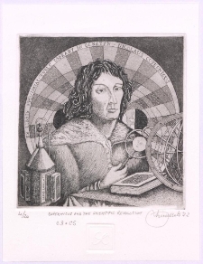 Ekslibris wykonany techniką C3, C5 ; format 16x20 cm ; praca wykonana w ramach Międzynarodowego Konkursu na Ekslibris „Ruszył Ziemię” zorganizowanego z okazji 550. rocznicy urodzin Mikołaja Kopernika