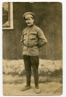 stan zachowania: bardzo dobry ; Władysław Sienicki – podoficer wojska carskiego w obozie w Preußisch Holland (Pasłęk). Ma na nogach własnoręcznie zrobione łapcie (zrobione z gałązek krzaków), aby latem nie chodzić w butach zimowych. ; Zdjęcie z kolekcji Władysława Sienickiego, który został wcielony do armii carskiej zaraz po wybuchu I wojny światowej. Dostał przydział do Witebska, gdzie przebywał prawdopodobnie do początków 1916 r. Tam też został podoficerem armii carskiej. Już w 1916 r. został skierowany na front do walki z Niemcami, gdzie dostał się do niewoli. Osadzono go w obozie dla jeńców wojennych w Schneidemühl (Piła), skąd w marcu 1917 r. wysłał pocztówkę do rodziny. Na początku 1918 r. został przeniesiony do obozu jenieckiego w Preußisch Holland (Pasłęk) w Prusach Wschodnich. Tam doczekał końca wojny. 22 września 1918 r. wysłał do rodziny swoją fotografię z tego obozu. Z Pasłęka przywiózł do domu kolekcję fantastycznych czarno-białych zdjęć doskonale ilustrujących życie oficerów oraz zwykłych żołnierzy armii carskiej w tym obozie. W 1919 r. Władysław Sienicki wstąpił do armii gen. Józefa Hallera.