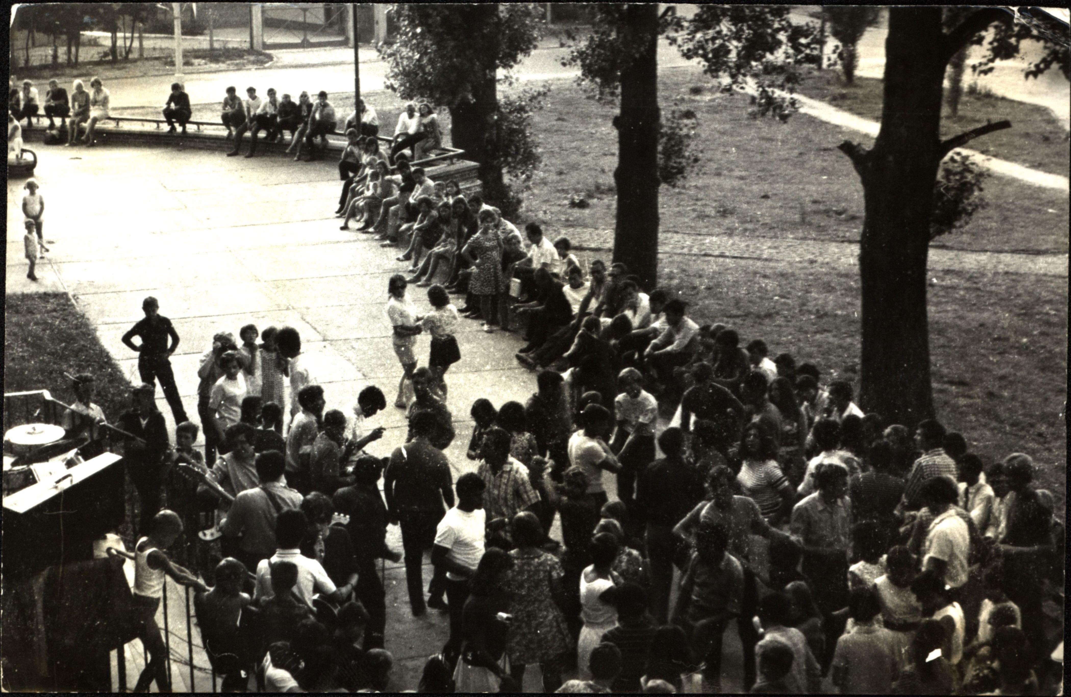 Fragment placu PCK przy domu kultury ; w głębi brama stadionu miejskiego ; fotografia czarno-biała (błyszcząca) ; format 18 x 23 cm