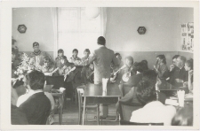 Szkolny zespół mandolinistów wita bibliotekarzy wrocławskich pieśnią „O Warmio moja miła” (opis według odręcznej noty na odwrocie fotografii ; autor fotografii nieznany ; fotografia czarno-biała (błyszcząca) ; format 9 x 14 cm