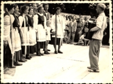 Akompaniament muzyczny Marian Zborowski-Weychman - kierownik Domu Harcerza oficjalnie otwartego 27.01.1952 r. i po zmianie nazwy w 1956 r. kierownik Domu Kultury Dzieci i Młodzieży do 31.08.1974 r. ; fotografia czarno-biała (błyszcząca) ; format 9 x 14 cm ; brzegi ząbkowane