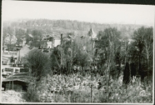 Widok od strony os. Mazurskiego ; na pierwszym planie: cmentarz, a z lewej nieistniejacy (obecnie) zakład drzewny Tartak ; w tle wieża kościoła ewangelickiego ; fotografia czarno-biała (błyszcząca) ; format 9 x 13 cm ; nierówne wymiary fotografii