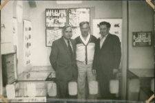 Na wystawie numizmatycznej w Szkole Podstawowej nr 1 w Mrągowie (obecnie Zespół Szkół nr 1) ; od lewej: Marian Zglejc, Ryszard Bitowt - nauczyciel, numizmatyk, kronikarz Mrągowa, Stefan Kużdżał ; fotografia czarno-biała (błyszcząca) ; format 9 x 14 cm ; zniszczenia narożników