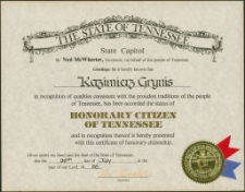 Przyznanie statusu Honorowego Obywatela Stanu Tenneesse dla Kazimierza Grynisa potwierdzonego pieczęcią i nieczytelnym podpisem gubernatora ; dokument (z datą 24.07.1988) druk jednostronny, kolorowy, sztywny ; format 29 x 31 cm