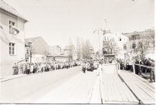 Title: [Trybuna honorowa i ulica Ratuszowa przed pochodem pierwszomajowym w Mrągowie 1973]