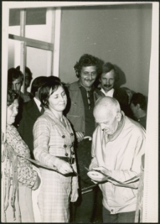 Tadeusz Borowski - autor wernisażu przecina wstęgę ; w tle od prawej: Jan Gudelis - nauczyciel, harcerz, artysta plastyk ; Waldemar Tański ; fotografia czarno-biała (błyszcząca) ; format 13 x 18,3 cm