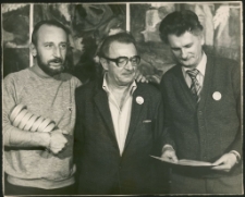 Operatorzy nieistniejącego (obecnie) kina "Mazur" ; od lewej: pierwszy Zygmunt Rakałowicz, trzeci Jerzy Ostaszewski ; fotografia czarno biała (błyszcząca) ; format 24 x 30 cm