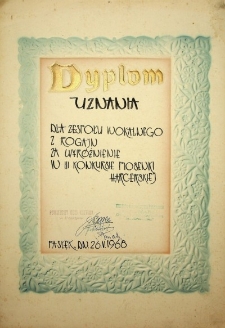 Dyplom dla Zespołu Woklanego z Rogajn za wyróżniene w III Konkursie Piosenki Harcerskiej w Pasłęku ; 26 maja 1968 ; Papier tłoczony, kolorowy ; Pismo odręczne, pieczęcie i podpisy ; Rewers: pieczęcie ciemnoniebieskie producenta i sprzedawcy ; Stan zachowania: dobry, zabrudzenia.