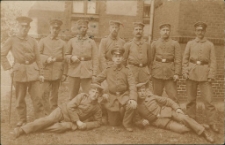 Żołnierze pruscy w koszarach Sensburga ; pocztówka dwukolorowa ; format 9 x 15 cm ; s. verso zapisana pismem odręcznym ; stempel pocztowy: Sensburg (data: 20.5.16) ; korespondencja w języku niemieckim