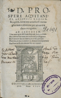 [8], 856, [12] stron, 8°. ; Oprawa: 1556, deski, cielęca skóra, częściowo złocony ślepy wytłok liniowy, roślinny, postaciowy, heraldyczny, tekstowy: z przodu DIVI PROSPERI OPERA 1556, górna połowa orła w kartuszu herbowym; z tyłu postacie SALVATOR, PAVLVS; obcięcie kart barwione żółto, na dolnym: Diui Prosperi Opera. ; Proweniencja: 1. Reuerendus Dominus Stanislaus Cromer Canonicus Warmiensis Pro loco Wartemburg Fratrum Bernardinorum (XVI/XVII w.). 2. Bibliothek des Königlichen Lyceum Hosianum in Braunsberg 1906.