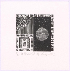 Linoryt ; format 13x13 cm ; praca wykonana w ramach Międzynarodowego Konkursu na Ekslibris „Ruszył Ziemię” zorganizowanego z okazji 550. rocznicy urodzin Mikołaja Kopernika