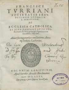 [12], 330, [1]. 4° ; Oprawa: XVII w., gładka świńska skóra, zawiązania skórkowe zachowane, na grzbiecie naklejka z ręcznym napisem: Francisci Turriani de Ecclesia, obcięcia kart barwione sino, na górnym napis: Francisci Turriani de Ecclesia Catholica et pastore eius ; Proweniencja: 1. Pro loco Wartenburgensi ad fratres Bernardinos gratia Domini Domini Cromeri Canonici Warmiensis (XVI/XVII w.). 2. Bibliotheca Lycei Regii Hosiani (pieczątka XIX w.)