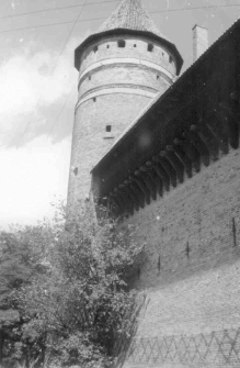 Widok z dołu na ścianę południową budowli i wieżę ; fotografia czarno-biała (błyszcząca) ; format 6,5 x 9,5 cm