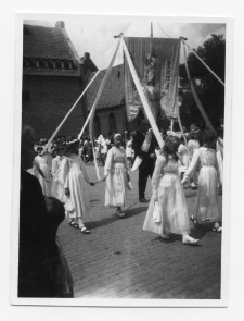 fotografia czarno-biała ; Stan zachowania: bardzo dobry ; Procesja Bożego Ciała na ulicy Bolesława Chrobrego w Pasłęku, w tle widoczny odbudowany Ratusz Staromiejski. Na rewersie opis zdjęcia wykonany przez darczyńcę, panią Urszulę Bełza.