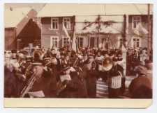 Fotografia barwna ; Stan zachowania: bardzo dobry ; Dar Janiny i Edmunda Leśniewicz ; Wprowadzenie do kościoła w Zielonce Pasłęckiej obrazu Chrystusa Tarnorudzkiego. Na pierwszym planie orkiestra dęta z Zielonki Pasłęckiej (na pierwszym planie z trąbką Edmund Leśniewicz), dalej księża, ksieża biskupi oraz streażacy miejscowej OSP niosący obraz. ; Uroczystościom przewodzil ks. bp. Edmund Piszcz