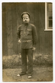 stan zachowania: bardzo dobry ; Żołnierz carski osadzony w obozie jenieckim w Preußisch Holland (Pasłęk). Piechota. Ma zegarek z dewizką. Na nogach łapcie zrobione specjalnie na lato, aby nie chodzić w butach zimowych ; Zdjęcie z kolekcji Władysława Sienickiego, który został wcielony do armii carskiej zaraz po wybuchu I wojny światowej. Dostał przydział do Witebska, gdzie przebywał prawdopodobnie do początków 1916 r. Tam też został podoficerem armii carskiej. Już w 1916 r. został skierowany na front do walki z Niemcami, gdzie dostał się do niewoli. Osadzono go w obozie dla jeńców wojennych w Schneidemühl (Piła), skąd w marcu 1917 r. wysłał pocztówkę do rodziny. Na początku 1918 r. został przeniesiony do obozu jenieckiego w Preußisch Holland (Pasłęk) w Prusach Wschodnich. Tam doczekał końca wojny. 22 września 1918 r. wysłał do rodziny swoją fotografię z tego obozu. Z Pasłęka przywiózł do domu kolekcję fantastycznych czarno-białych zdjęć doskonale ilustrujących życie oficerów oraz zwykłych żołnierzy armii carskiej w tym obozie. W 1919 r. Władysław Sienicki wstąpił do armii gen. Józefa Hallera.