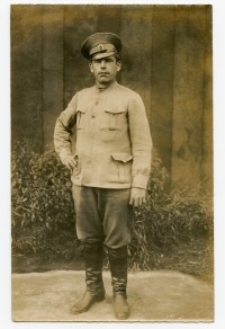 stan zachowania: bardzo dobry ; Podoficer piechoty carskiej osadzony w obozie jenieckim w Preussisch Holland (Pasłęk). Mundur podoficera piechoty ; Zdjęcie z kolekcji Władysława Sienickiego, który został wcielony do armii carskiej zaraz po wybuchu I wojny światowej. Dostał przydział do Witebska, gdzie przebywał prawdopodobnie do początków 1916 r. Tam też został podoficerem armii carskiej. Już w 1916 r. został skierowany na front do walki z Niemcami, gdzie dostał się do niewoli. Osadzono go w obozie dla jeńców wojennych w Schneidemühl (Piła), skąd w marcu 1917 r. wysłał pocztówkę do rodziny. Na początku 1918 r. został przeniesiony do obozu jenieckiego w Preußisch Holland (Pasłęk) w Prusach Wschodnich. Tam doczekał końca wojny. 22 września 1918 r. wysłał do rodziny swoją fotografię z tego obozu. Z Pasłęka przywiózł do domu kolekcję fantastycznych czarno-białych zdjęć doskonale ilustrujących życie oficerów oraz zwykłych żołnierzy armii carskiej w tym obozie. W 1919 r. Władysław Sienicki wstąpił do armii gen. Józefa Hallera.