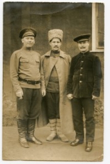 Stan zachowania: bardzo dobry ; Żołnierze carscy osadzeni w obozie jenieckim w Preußisch Holland (Pasłęk). Kawalerzysta (spodnie z lampasami). Piechota (żołnierz w szynelu i łapciach). Kolejarz (mundur i furażerka kolejarza) ; Zdjęcie z kolekcji Władysława Sienickiego, który został wcielony do armii carskiej zaraz po wybuchu I wojny światowej. Dostał przydział do Witebska, gdzie przebywał prawdopodobnie do początków 1916 r. Tam też został podoficerem armii carskiej. Już w 1916 r. został skierowany na front do walki z Niemcami, gdzie dostał się do niewoli. Osadzono go w obozie dla jeńców wojennych w Schneidemühl (Piła), skąd w marcu 1917 r. wysłał pocztówkę do rodziny. Na początku 1918 r. został przeniesiony do obozu jenieckiego w Preußisch Holland (Pasłęk) w Prusach Wschodnich. Tam doczekał końca wojny. 22 września 1918 r. wysłał do rodziny swoją fotografię z tego obozu. Z Pasłęka przywiózł do domu kolekcję fantastycznych czarno-białych zdjęć doskonale ilustrujących życie oficerów oraz zwykłych żołnierzy armii carskiej w tym obozie. W 1919 r. Władysław Sienicki wstąpił do armii gen. Józefa Hallera.