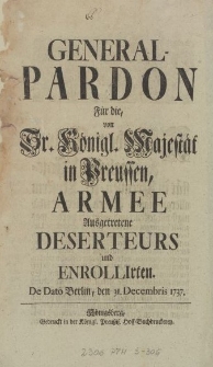 | General-Pardon Für die, von Sr. Königl. Majestät in Preussen, Armee Ausgetretene Deserteurs und Enrollirten. - 1737 | 2024-04-26 |