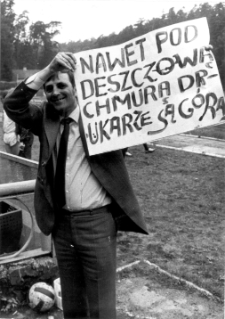 Mecz piłki nożnej drukarze-dziennikarze 21.05.85 r. Na zjęciu kibic drukarzy ... (odręczna nota na odwrocie fotografii) ; autor fotografii nieznany ; fotografia czarno-biała (błyszcząca) ; format 13 x 18 cm