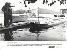 Przystań ośrodka nad Jeziorakiem. Pod zdjęciem błędna nazwa instytutu ("Okręgowego" zamiast "Okrętowego") ; fotografia czarno-biała (błyszcząca) ; format 21 x 28 cm