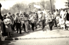 Pracownicy kultury w pochodzie pierwszomajowym (lata siedemdziesiąte), wymarsz spod domu kultury na ul. Warszawskiej ; s. verso zawiera odręczne zapiski cyfr ; fotografia czarno-biała (błyszcząca) ; format 9 x 14 cm