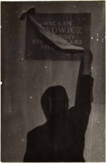 Pamiątkową tablicę odsłania prof. Stefan Kubów ; zdjęcie wykonane 23.05.1984 (według wpisu w kronice) naklejone na sztywną kartę ; fotografia czarno-biała (błyszcząca) ; format 9 x 14 cm