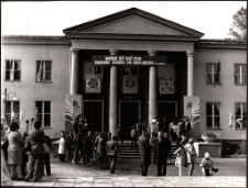 Przed Powiatowym Domem Kultury ; fotografia czarno-biała (błyszcząca) ; format 18,5 x 24 cm