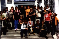 Zdjęcie wykonane na schodach przed biblioteką 29.04.2010 r. ; bibliotekarze z Białorusi i Niemiec z międzynarodowej wymiany realizowanej przez Fundację Rodowo ; fotografia naklejona na kartę ; fotografia kolorowa (błyszcząca) ; format 20 x 30 cm