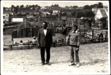 Od prawej autor drewnianych rzeźb Wiesław Rydzyński ; w tle ulice Dziękczynna, Wojska Polskiego, Piaskowa ; fotografia czarno-biała (błyszcząca) ; format 8,5 x 12,5 cm