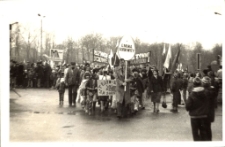 Wymarsz pochodu pierwszomajowego z Placu Piłsudskiego (Pl. Zwycięstwa w l. 1969-1997) ; fotografia czarno-biała (błyszcząca) ; format 9 x 14 cm