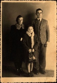 S. verso zawiera odręczną notę "Siostra i szwagier z córką Zosią tatusia, Bakułowie" ; fotografia czarno-biała (matowa) ; format 8,5 x 12 cm ; zniszczenia prawej i dolnej krawędzi ; brzegi ząbkowane